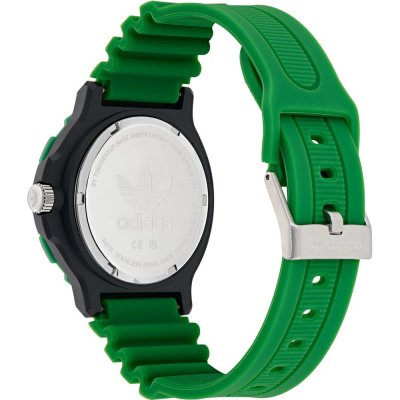 Este reloj marca Adidas tiene una caja de Resina con un diámetro de 40 mm y cuenta con una correa de Goma. Dentro de la caja se encuentra un mecanismo de Timex de alta calidad el cual esta protegido por un cristal Mineral.