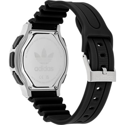 Este reloj marca Adidas tiene una caja de Inox con un diámetro de 44 mm y cuenta con una correa de Goma. Dentro de la caja se encuentra un mecanismo de Timex de alta calidad el cual esta protegido por un cristal Mineral.