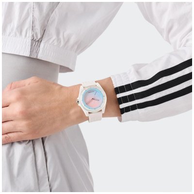 Este reloj marca Adidas tiene una caja de Resina con un diámetro de 41 mm y cuenta con una correa de Resina. Dentro de la caja se encuentra un mecanismo de Timex de alta calidad el cual esta protegido por un cristal Acrílico.