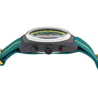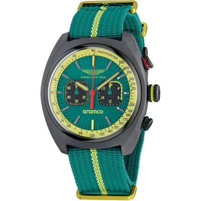 Este reloj marca Aston Martin tiene una caja de Resina con un diámetro de 43 mm y cuenta con una correa de Nylon. Dentro de la caja se encuentra un mecanismo de Timex de alta calidad el cual esta protegido por un cristal Acrílico.