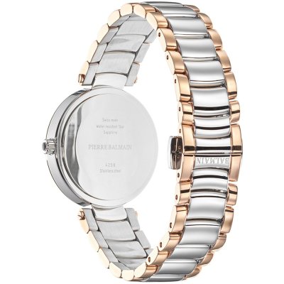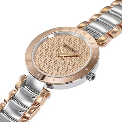 Este reloj marca Balmain tiene una caja de Inox con un diámetro de 33 mm y cuenta con una correa de Inox. Dentro de la caja se encuentra un mecanismo de ETA de alta calidad el cual esta protegido por un cristal Zafiro.