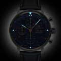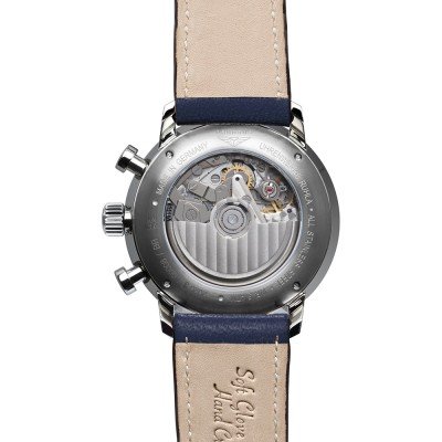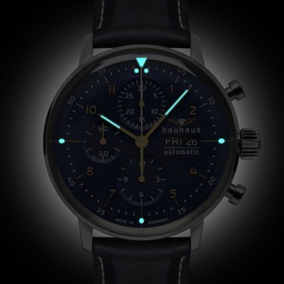Este cronógrafo automático de estilo aviador, modernista pero clásico, combina el diseño aerodinámico Bauhaus con detalles sutiles. Por ejemplo, los pequeños puntos perfilados de lumen a las 3, 6 y 9 horas y el triángulo y el doble punto a las 12 horas de estilo aviador clásico. Las agujas doradas contrastan con la esfera azul noche, en la que las subesferas están sutilmente marcadas. El reloj funciona con un movimiento suizo Sellita SW500 de 25 rubíes con 48 horas de reserva de marcha.
