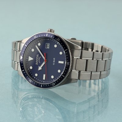 Este reloj marca Boccia tiene una caja de Titanio con un diámetro de 39 mm y cuenta con una correa de Titanio. Dentro de la caja se encuentra un mecanismo de Miyota de alta calidad el cual esta protegido por un cristal Mineral.