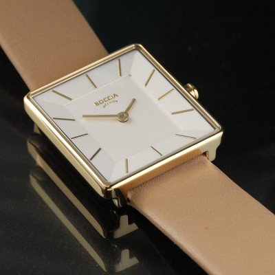 Este reloj marca Boccia tiene una caja de Titanio con un diámetro de 25 mm y cuenta con una correa de piel. Dentro de la caja se encuentra un mecanismo de Miyota de alta calidad el cual esta protegido por un cristal Mineral.