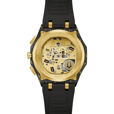 Este reloj marca Bulova tiene una caja de Resina reforzada con carbono con un diámetro de 44 mm y cuenta con una correa de Goma. Dentro de la caja se encuentra un mecanismo de Bulova de alta calidad el cual esta protegido por un cristal Zafiro antirreflectante solitario.