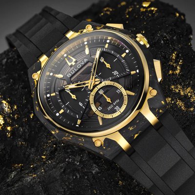 El Bulova Curv es una maravilla de la ingeniería técnica con un elegante diseño ergonómico y una caja delgada nunca antes posible en un reloj cronógrafo. Bulova rompe las reglas con el primer movimiento cronógrafo curvo del mundo. Todos los relojes Curv funcionan con un movimiento de cuarzo patentado de alta precisión con una frecuencia de 262 kHz que ofrece una precisión extraordinaria. Conozca nuestro Curv 2025. Un nuevo diseño y nuevos materiales innovadores convergen para crear esta llamativa caja. El carbono forjado se combina con una lámina de oro de 97,97% de oro puro para albergar nuestro movimiento Curv. El marco de la caja resalta el nuevo diseño de la esfera y se realza con una correa de caucho HNBR de primera calidad y hebilla desplegable para un cómodo ajuste a la muñeca.