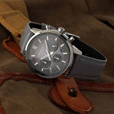 Este reloj marca Casio Edifice tiene una caja de Inox con un diámetro de 41 mm y cuenta con una correa de Textil y cuero. Dentro de la caja se encuentra un mecanismo de Casio de alta calidad el cual esta protegido por un cristal Mineral.
