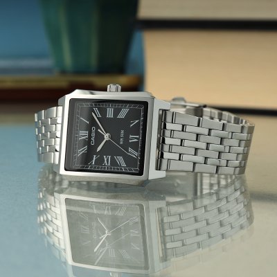Este reloj marca Casio tiene una caja de Inox con un diámetro de 32 mm y cuenta con una correa de Inox. Dentro de la caja se encuentra un mecanismo de Casio de alta calidad el cual esta protegido por un cristal Mineral.