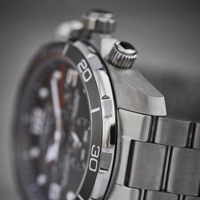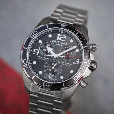 Este cronógrafo de buceo de cuarzo y titanio incorpora un movimiento Precidrive certificado por el COSC, que garantiza una precisión excepcional. Otras características son un bisel unidireccional de aluminio, resistencia al agua de 30 ATM, cronógrafo de 1/10 seg en tiempo real y 30 min, cristal de zafiro y excelente lumen. Como todos los relojes Certina, debido al DS-Concept de la marca, el reloj está construido para ser robusto y duradero.