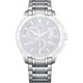 Esta correa de reloj de la :marca está hecha de acero inoxidable y se adjunta al reloj mediante pasadores de resorte. La banda tiene un ancho de 22 mm y se cierra mediante un cierre desplegable con botones pulsadores. La correa no tiene montura recta, lo que significa que esta correa sólo es adecuada para los relojes que se indican a continuación.