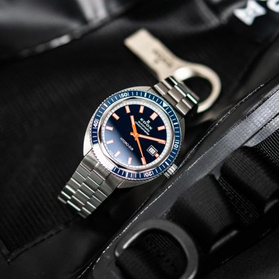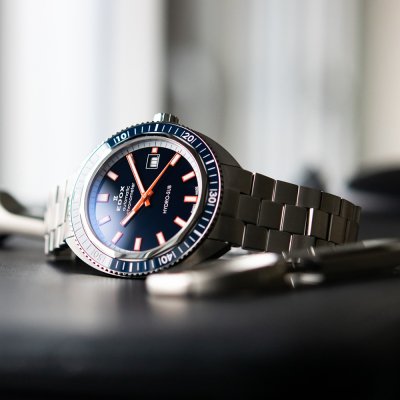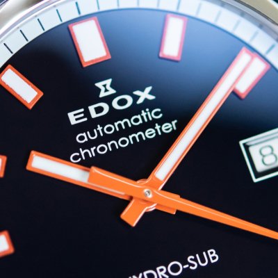 Este Edox Hydro-Sub es una edición especial limitada a solo 500 ejemplares. Es resistente al agua hasta 30 ATM y funciona con un movimiento automático Edox Calibre 806, que se basa en el Sellita SW200 y está certificado por COSC. Su diseño clásico se ve realzado por el discreto bisel de cerámica incrustado y las prominentes manecillas e índices luminosos.