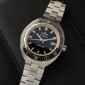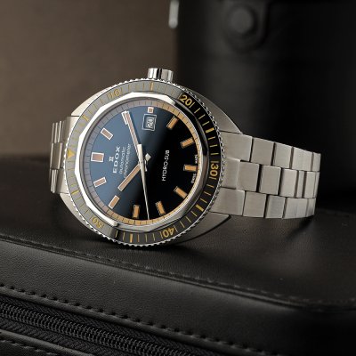 Este Edox Hydro-Sub es una edición especial limitada a solo 500 ejemplares. Es resistente al agua hasta 30 ATM y funciona con un movimiento automático Edox Calibre 806, que se basa en el Sellita SW200 y está certificado por COSC. Su diseño clásico se ve realzado por el discreto bisel de cerámica incrustado y las prominentes manecillas e índices luminosos.