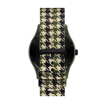 Este reloj marca Emporio Armani tiene una caja de Plástico de origen biológico con un diámetro de 45 mm y cuenta con una correa de Cuero ecológico. Dentro de la caja se encuentra un mecanismo de Miyota de alta calidad el cual esta protegido por un cristal Mineral.