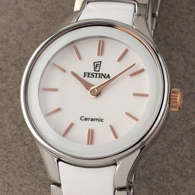 Este reloj marca Festina tiene una caja de Acero inoxidable y cerámica con un diámetro de 31 mm y cuenta con una correa de Cerámica. Dentro de la caja se encuentra un mecanismo de Miyota de alta calidad el cual esta protegido por un cristal Mineral.