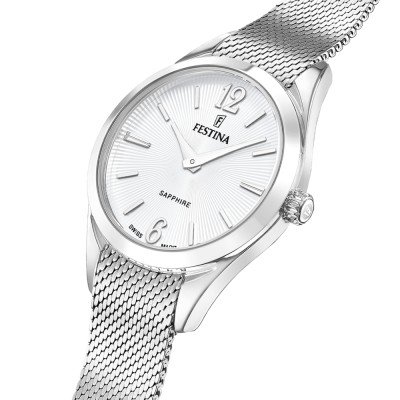 Este reloj marca Festina tiene una caja de Inox con un diámetro de 32 mm y cuenta con una correa de Inox. Dentro de la caja se encuentra un mecanismo de Ronda de alta calidad el cual esta protegido por un cristal Zafiro.