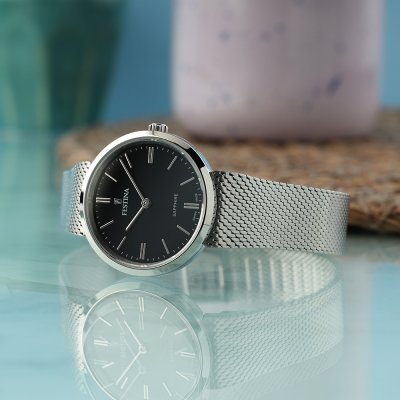 Este reloj marca Festina tiene una caja de Inox con un diámetro de 29 mm y cuenta con una correa de Inox. Dentro de la caja se encuentra un mecanismo de Ronda de alta calidad el cual esta protegido por un cristal Zafiro.
