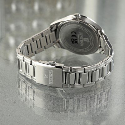 Este reloj marca Festina tiene una caja de Inox con un diámetro de 37 mm y cuenta con una correa de Inox. Dentro de la caja se encuentra un mecanismo de Ronda de alta calidad el cual esta protegido por un cristal Zafiro.