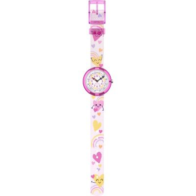 Este reloj marca Flik Flak tiene una caja de Plástico de origen biológico con un diámetro de 29.5 mm y cuenta con una correa de Textil. Dentro de la caja se encuentra un mecanismo de ETA de alta calidad el cual esta protegido por un cristal Acrílico.