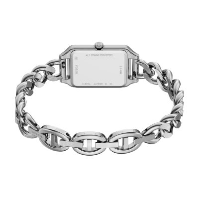 Este reloj marca Fossil tiene una caja de Inox con un diámetro de 23 mm y cuenta con una correa de Inox. Dentro de la caja se encuentra un mecanismo de Seiko Instruments Inc. de alta calidad el cual esta protegido por un cristal Mineral.