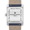 El reloj Frederique Constant Classics Carrée Moonphase, es un reloj refinado y excepcional con múltiples funciones. El movimiento de cuarzo FC-265 indica las horas, los minutos, los segundos, así como la fecha, el día, el mes y la fase lunar, con una impresionante autonomía de 60 meses. Todo ello está encerrado en una caja rectangular de 42,30 x 30 mm, fabricada en acero inoxidable chapado en oro amarillo pulido. La esfera plateada con acabado sol y un motivo en relieve en el centro, se compensa con índices y agujas chapados en oro, ofreciendo una legibilidad perfecta.