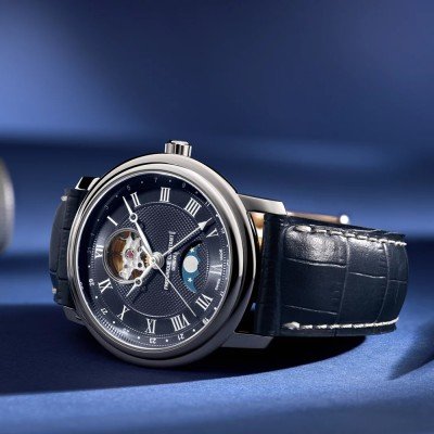 El reloj Frederique Constant Classics Heart Beat Moonphase revela su escape en movimiento continuo con una ventana en su corazón a las 12 horas. Se equilibra con una delicada indicación de las fases lunares a las 6 en la esfera elaboradamente decorada: una clásica decoración guilloché Clous de Paris, índices con números romanos, delicadas agujas Breguet y un indicador de fecha. El reloj funciona con un movimiento automático FC-335 basado en el Sellita SW200, con 38 horas de reserva de marcha. La alta relojería se une al estilo clásico y al movimiento moderno en este bello reloj.