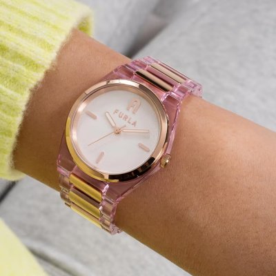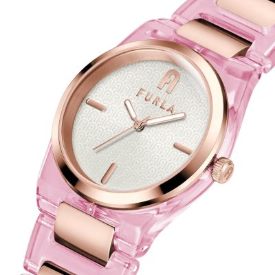 Este reloj marca Furla tiene una caja de Acero inoxidable y plástico con un diámetro de 34 mm y cuenta con una correa de Acero inoxidable y plástico. Dentro de la caja se encuentra un mecanismo de Miyota de alta calidad el cual esta protegido por un cristal Mineral.