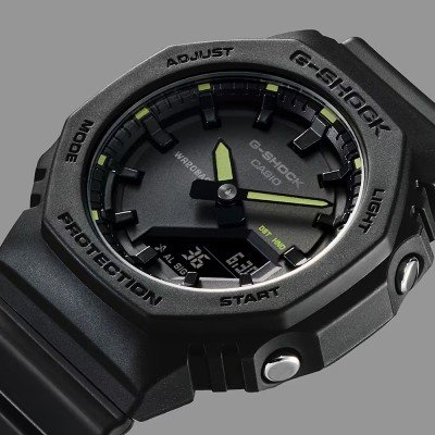 Los minimalistas y compactos relojes GMA-P2100 se unen a los GA-2100 y GMA-S2100 en la línea 2100 de relojes octogonales de distintos tamaños. Los relojes GMA-P2100 presentan ahora un diseño minimalista sin la esfera encastrada que tenían los otros, empleando acabados monocromáticos en colores vibrantes para elevar el espíritu. Los componentes individuales están acabados en diferentes tonos y texturas para dar una sensación más intrincada.