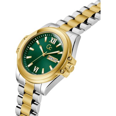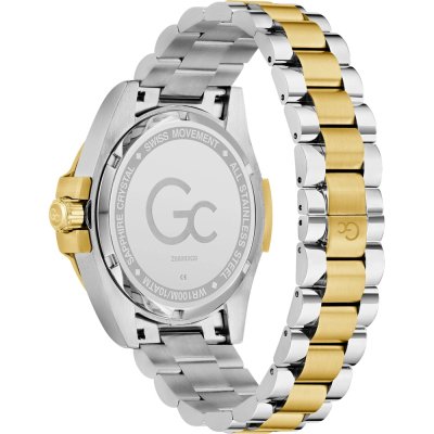 Este reloj marca GC tiene una caja de Inox con un diámetro de 43 mm y cuenta con una correa de Inox. Dentro de la caja se encuentra un mecanismo de Ronda de alta calidad el cual esta protegido por un cristal Zafiro.