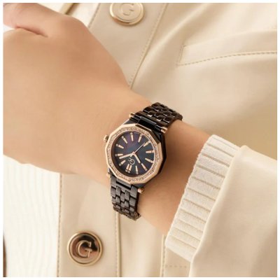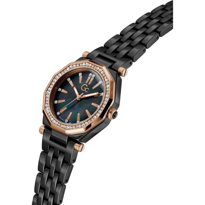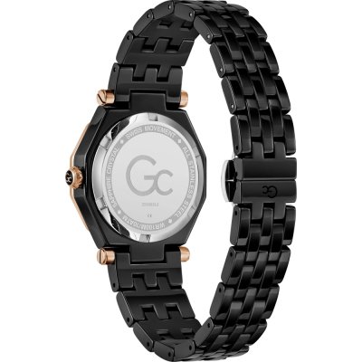 Este reloj marca GC tiene una caja de Inox con un diámetro de 32 mm y cuenta con una correa de Cerámica. Dentro de la caja se encuentra un mecanismo de Ronda de alta calidad el cual esta protegido por un cristal Zafiro.