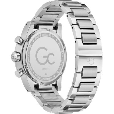 Este reloj marca GC tiene una caja de Inox con un diámetro de 42 mm y cuenta con una correa de Inox. Dentro de la caja se encuentra un mecanismo de Ronda de alta calidad el cual esta protegido por un cristal Zafiro.