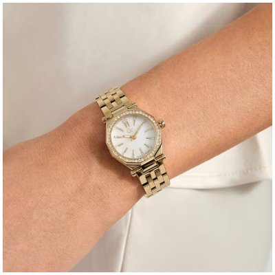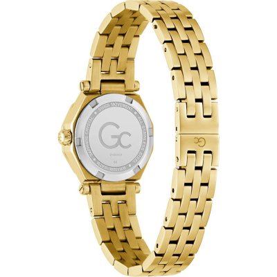 Este reloj marca GC tiene una caja de Inox con un diámetro de 26 mm y cuenta con una correa de Inox. Dentro de la caja se encuentra un mecanismo de Ronda de alta calidad el cual esta protegido por un cristal Mineral recubierto de zafiro.