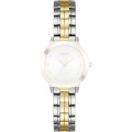 Esta correa de reloj de la :marca está hecha de metal y se adjunta al reloj mediante pasadores de resorte. La banda tiene un ancho de 14 mm y se cierra mediante un cierre desplegable con botones pulsadores. La correa no tiene montura recta, lo que significa que esta correa sólo es adecuada para los relojes que se indican a continuación.