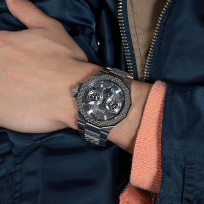 Este reloj marca Guess tiene una caja de Inox con un diámetro de 45 mm y cuenta con una correa de Inox. Dentro de la caja se encuentra un mecanismo de Seiko Instruments Inc. de alta calidad el cual esta protegido por un cristal Mineral.