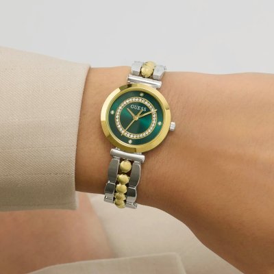 Este reloj marca Guess tiene una caja de Inox con un diámetro de 26 mm y cuenta con una correa de Inox. Dentro de la caja se encuentra un mecanismo de Seiko de alta calidad el cual esta protegido por un cristal Mineral.
