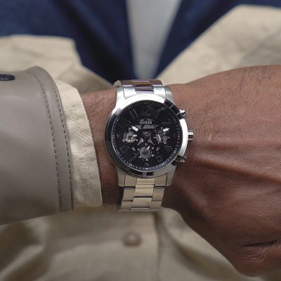 Este reloj marca Guess tiene una caja de Inox con un diámetro de 44 mm y cuenta con una correa de Inox. Dentro de la caja se encuentra un mecanismo de Seiko Instruments Inc. de alta calidad el cual esta protegido por un cristal Mineral.