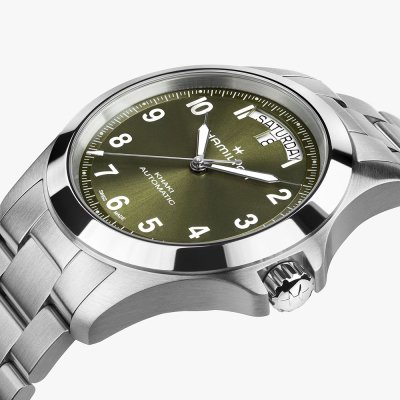 Este reloj marca Hamilton tiene una caja de Inox con un diámetro de 40 mm y cuenta con una correa de Inox. Dentro de la caja se encuentra un mecanismo de ETA de alta calidad el cual esta protegido por un cristal Zafiro antirreflectante solitario.