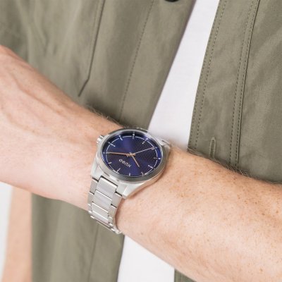 Este reloj marca Hugo Boss tiene una caja de Inox con un diámetro de 41 mm y cuenta con una correa de Inox. Dentro de la caja se encuentra un mecanismo de Seiko de alta calidad el cual esta protegido por un cristal Mineral.