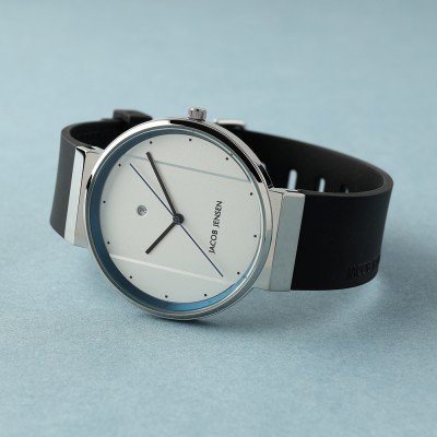 Este reloj marca Jacob Jensen tiene una caja de Inox con un diámetro de 39 mm y cuenta con una correa de Goma. Dentro de la caja se encuentra un mecanismo de Ronda de alta calidad el cual esta protegido por un cristal Mineral.