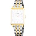 Esta correa de reloj de la :marca está hecha de acero inoxidable y se adjunta al reloj mediante pasadores de resorte. La banda tiene un ancho de 17 mm y se cierra mediante un cierre desplegable con botones pulsadores. La correa no tiene montura recta, lo que significa que esta correa sólo es adecuada para los relojes que se indican a continuación.