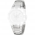 Esta correa de reloj de la :marca está hecha de acero inoxidable y se adjunta al reloj mediante pasadores de resorte. La banda tiene un ancho de 25 mm y se cierra mediante un cierre desplegable con botones pulsadores. La correa no tiene montura recta, lo que significa que esta correa sólo es adecuada para los relojes que se indican a continuación.