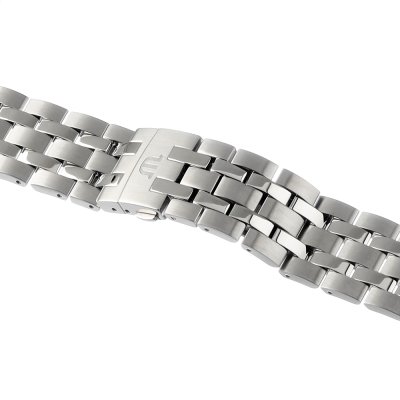 Esta correa de reloj de la :marca está hecha de acero inoxidable y se adjunta al reloj mediante pasadores de resorte. La banda tiene un ancho de 20 mm y se cierra mediante un cierre desplegable con botones pulsadores. La correa no tiene montura recta, lo que significa que esta correa sólo es adecuada para los relojes que se indican a continuación.