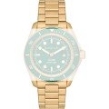 Esta correa de reloj de la :marca está hecha de acero inoxidable y se adjunta al reloj mediante pasadores de resorte. La banda tiene un ancho de 22 mm y se cierra mediante un cierre desplegable con botones pulsadores. La correa no tiene montura recta, lo que significa que esta correa sólo es adecuada para los relojes que se indican a continuación.