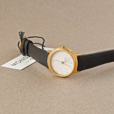 Este reloj marca Mondaine tiene una caja de Inox con un diámetro de 26 mm y cuenta con una correa de piel. Dentro de la caja se encuentra un mecanismo de Ronda de alta calidad el cual esta protegido por un cristal Zafiro.