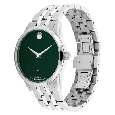 El Movado Museum Classic tiene una esfera que se acerca lo más posible al diseño original. Con un aspecto tan puro y minimalista, no hay lugar para el descuido. La esfera lacada con acabado mate -en la que sólo una pequeña ventana de fecha rompe la armonía- contrasta con el característico punto de mediodía. Las afiladas agujas Dauphine, bellamente talladas, añaden otra capa de nitidez y nivel de interés, mostrando una atención extrema al detalle. El reloj funciona con un movimiento automático suizo SW200 con 38 horas de reserva de marcha, visible a través del fondo de la caja.