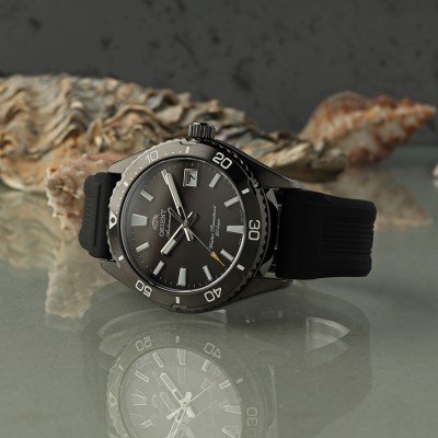 Este reloj marca Orient tiene una caja de Inox con un diámetro de 40 mm y cuenta con una correa de Goma. Dentro de la caja se encuentra un mecanismo de Orient de alta calidad el cual esta protegido por un cristal Zafiro.