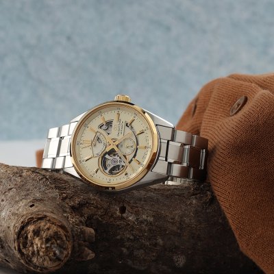 El Orient Star Modern Skeleton Automatic forma parte de la colección Contemporary. Lanzado en 2014, ha sido un éxito de ventas en todo el mundo desde su lanzamiento en 2014. Las últimas incorporaciones a la familia se caracterizan por colores de esfera que complementan las texturas metálicas de la caja y otras piezas del reloj que son visibles a través de aberturas ingeniosamente colocadas en la esfera. Junto a las ventanas que permiten ver el funcionamiento interno del reloj hay un indicador de reserva de marcha a las 12 horas y un pequeño segundero a las 6. El reloj funciona con un calibre mecánico de la casa F6F44 que ofrece una precisión estable de +25 segundos a 15 segundos por día y una reserva de marcha de 50 horas. La armonía visual entre la esfera y el movimiento mecánico subyacente crean una esfera de reloj que es a la vez práctica e intrigante; perfecta para el hombre que aprecia la atención al detalle y la tecnología.