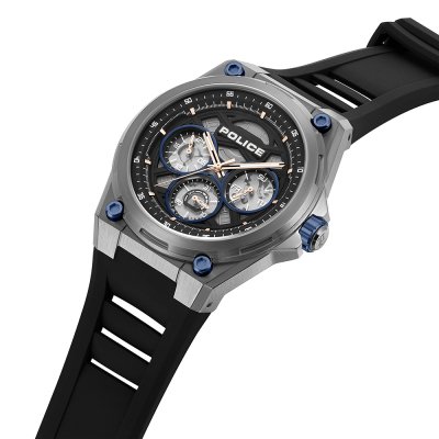Este reloj marca Police tiene una caja de Inox con un diámetro de 45 mm y cuenta con una correa de Goma. Dentro de la caja se encuentra un mecanismo de Seiko Instruments Inc. de alta calidad el cual esta protegido por un cristal Mineral.
