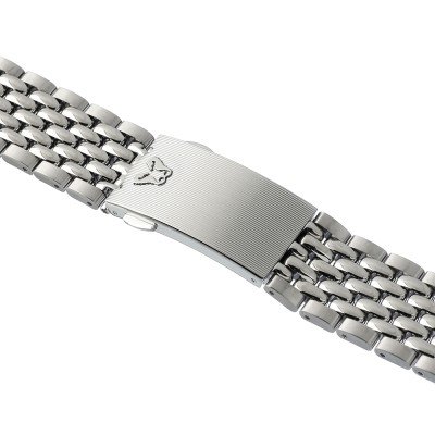 Esta correa de reloj de la :marca está hecha de acero inoxidable y se adjunta al reloj mediante pasadores de resorte. La banda tiene un ancho de 18 mm y se cierra mediante un cierre desplegable con botones pulsadores. La correa no tiene montura recta, lo que significa que esta correa sólo es adecuada para los relojes que se indican a continuación.