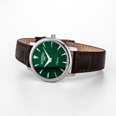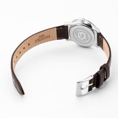 Este reloj marca Roamer tiene una caja de Inox con un diámetro de 30 mm y cuenta con una correa de piel. Dentro de la caja se encuentra un mecanismo de Ronda de alta calidad el cual esta protegido por un cristal Zafiro.