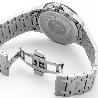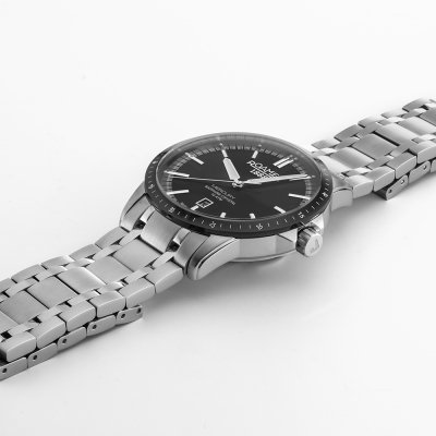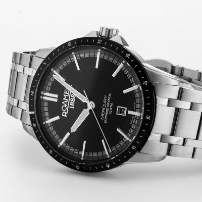 Este reloj marca Roamer tiene una caja de Inox con un diámetro de 42 mm y cuenta con una correa de Inox. Dentro de la caja se encuentra un mecanismo de Ronda de alta calidad el cual esta protegido por un cristal Zafiro.